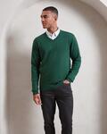 Cotton rich long sleeve sweater, V-neck styling, Fine gauge knit, Ribbed knit cuffs and hem, Worldwide Responsible Accredited Production (WRAP) certified production