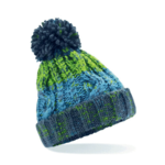 Tearaway label for ease of rebranding, Heavyweight multi yarn cable knit design, Non-removable pom pom for added safety, Bold four colour stripe design, Luxurious shearling thermal band for extra warmth, Cuffed design for optimal decoration, Available in Infant and Junior sizes